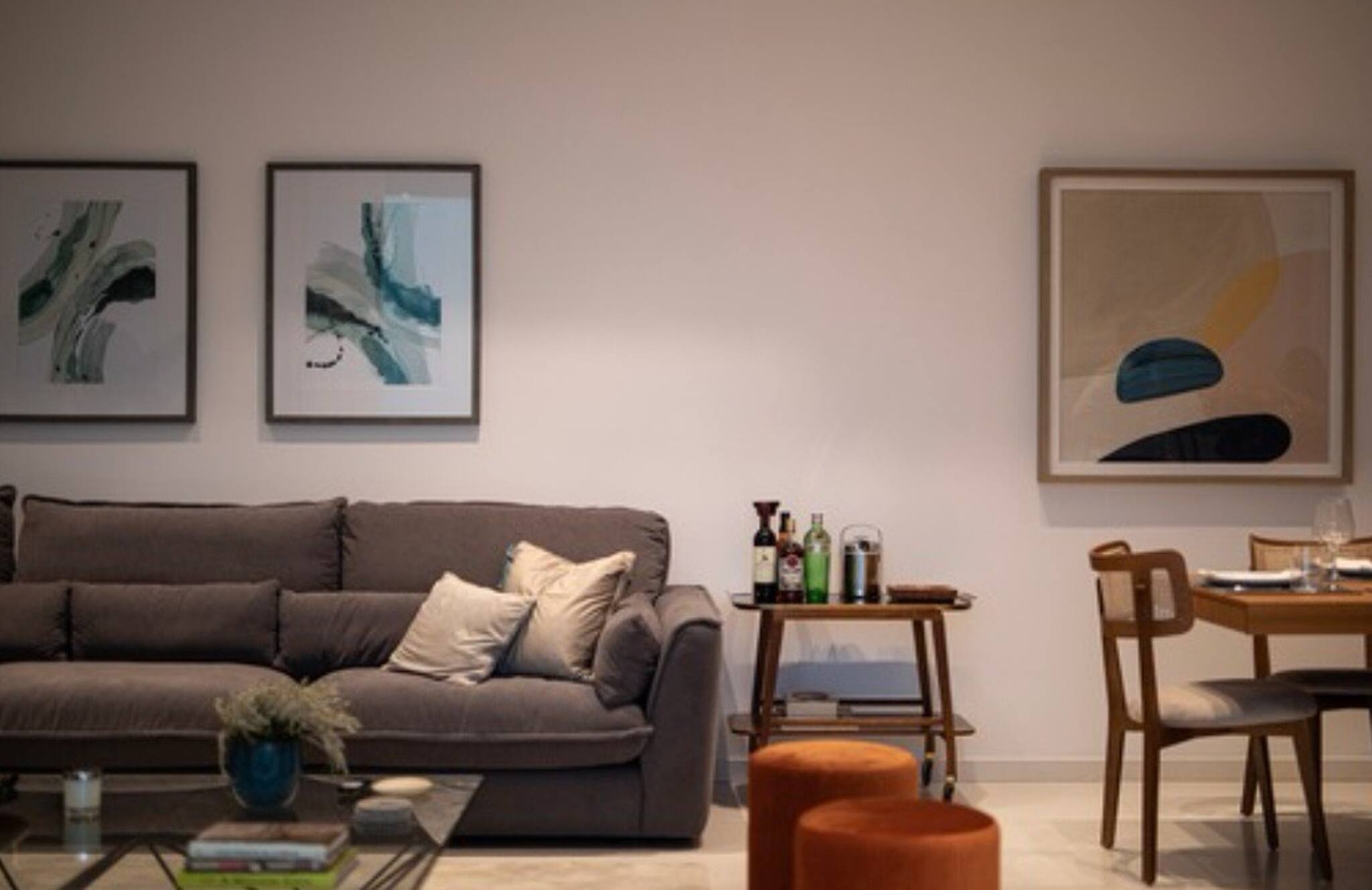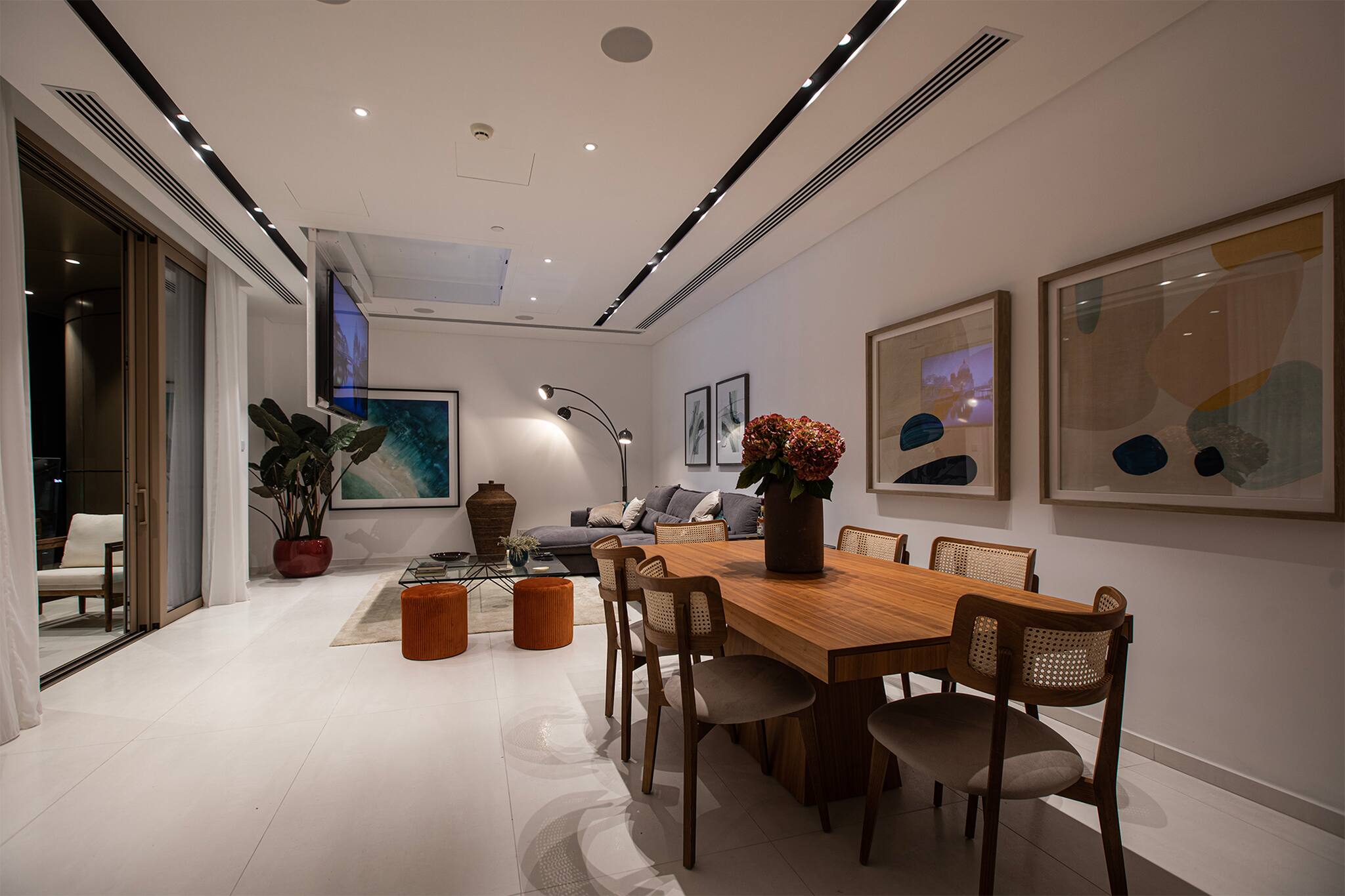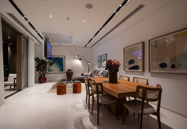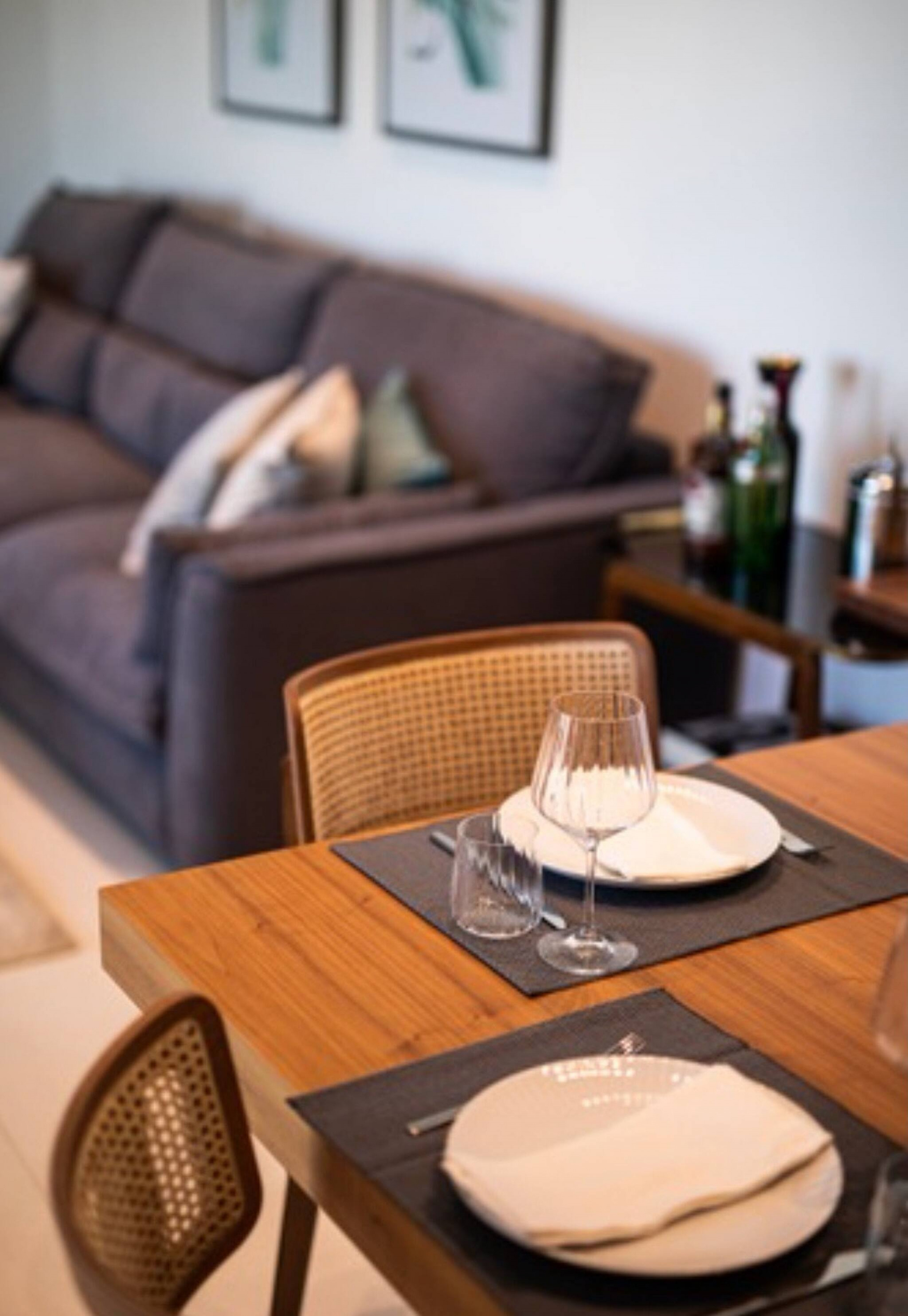 The one-bedroom apartment is thoughtfully designed with a king-sized bed, premium linens, and plenty of storage space. The en-suite bathroom features a spacious walk-in shower and premium toiletries. The living room is furnished with comfortable seating and a dining table for six.