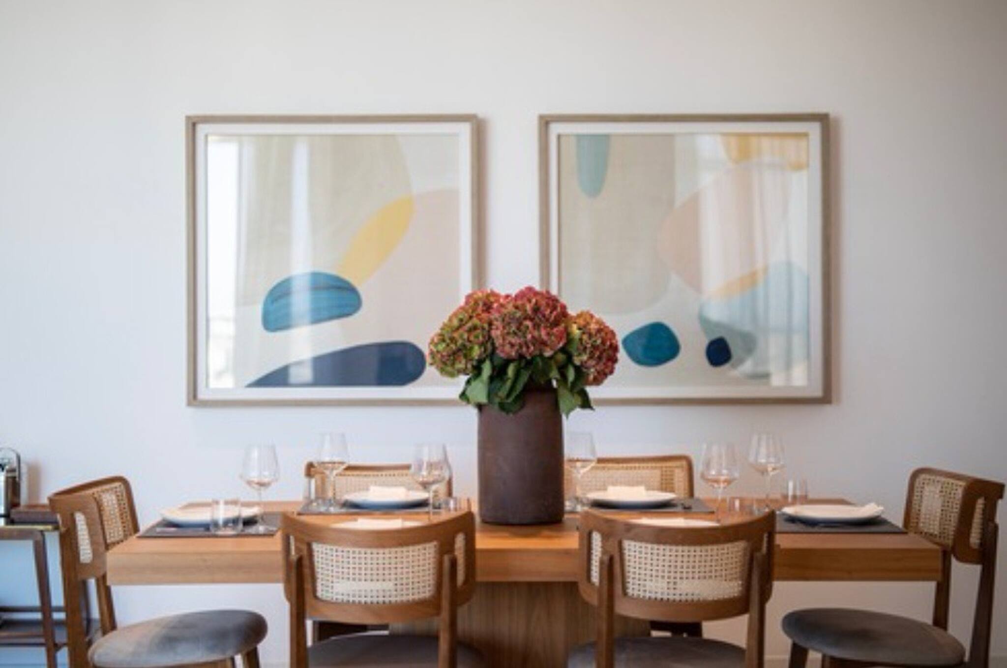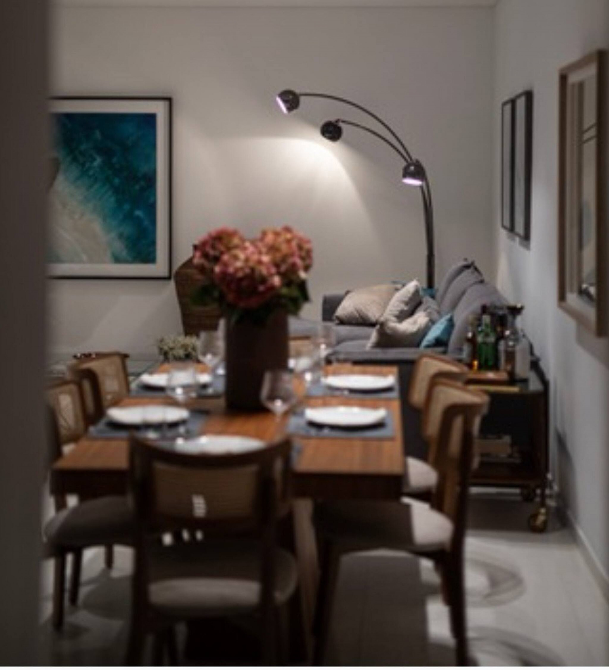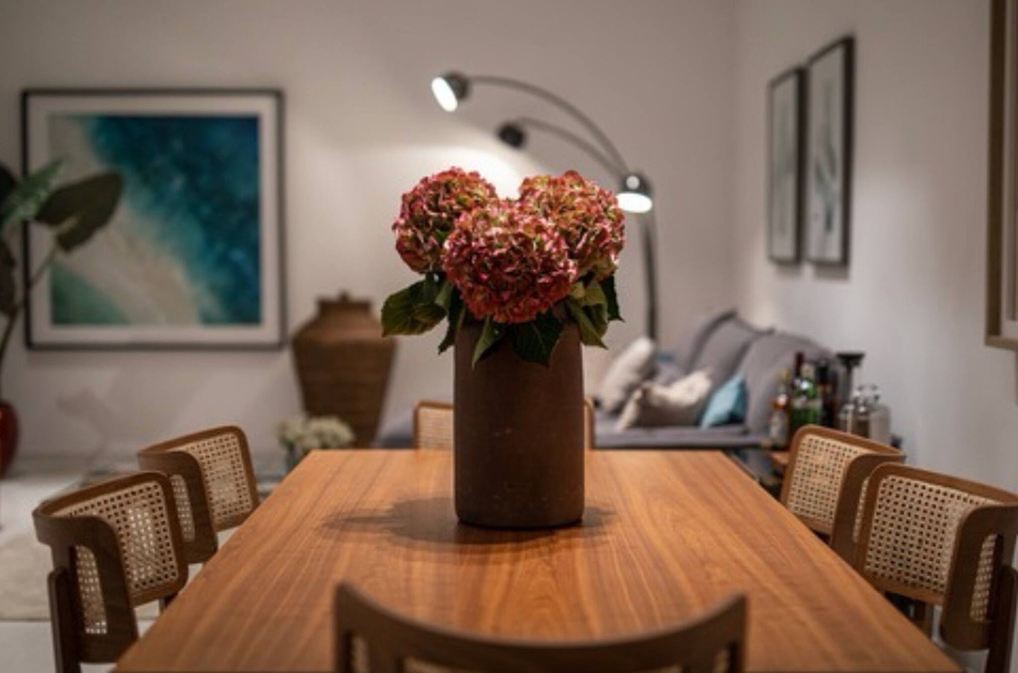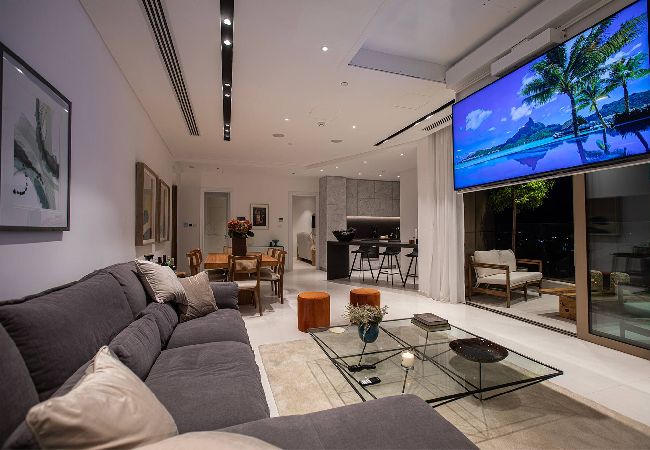 The one-bedroom apartment is thoughtfully designed with a king-sized bed, premium linens, and plenty of storage space. The en-suite bathroom features a spacious walk-in shower and premium toiletries. The living room is furnished with comfortable seating and a dining table for six.