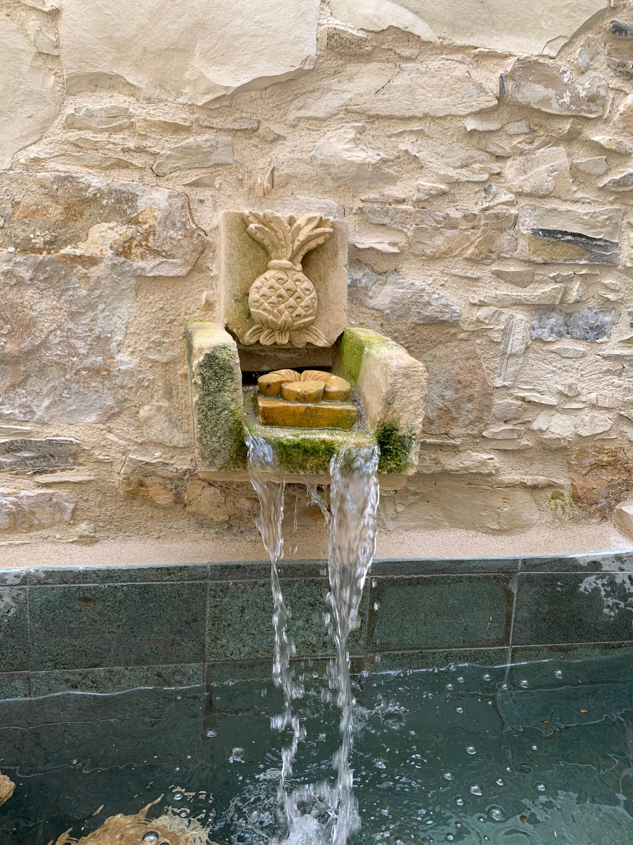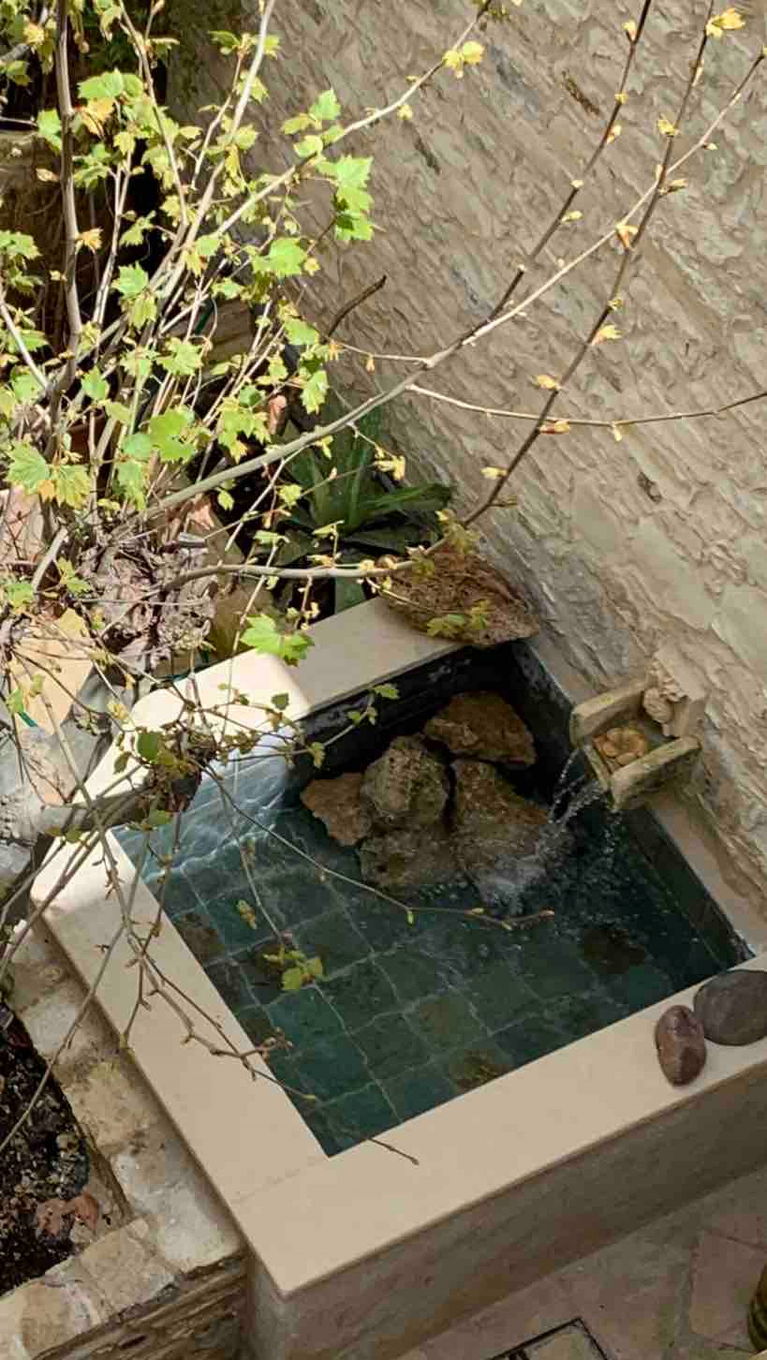 a limestone water feature under the shade of a maple tree. Ideal for the morning hours with the sound of swallows .