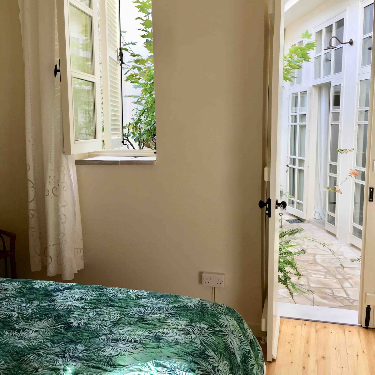 The ground floor consists of an entrance hall, a lounge, a double bedroom, a dining area, a TV room, and an additional annex guest bedroom with its own bathroom. This annex is accessed from the lush green patio, where the gentle sound of water flows from a limestone water feature, set beneath the shade of a maple tree. This space is especially magical in the morning hours, accompanied by the sound of swallows.