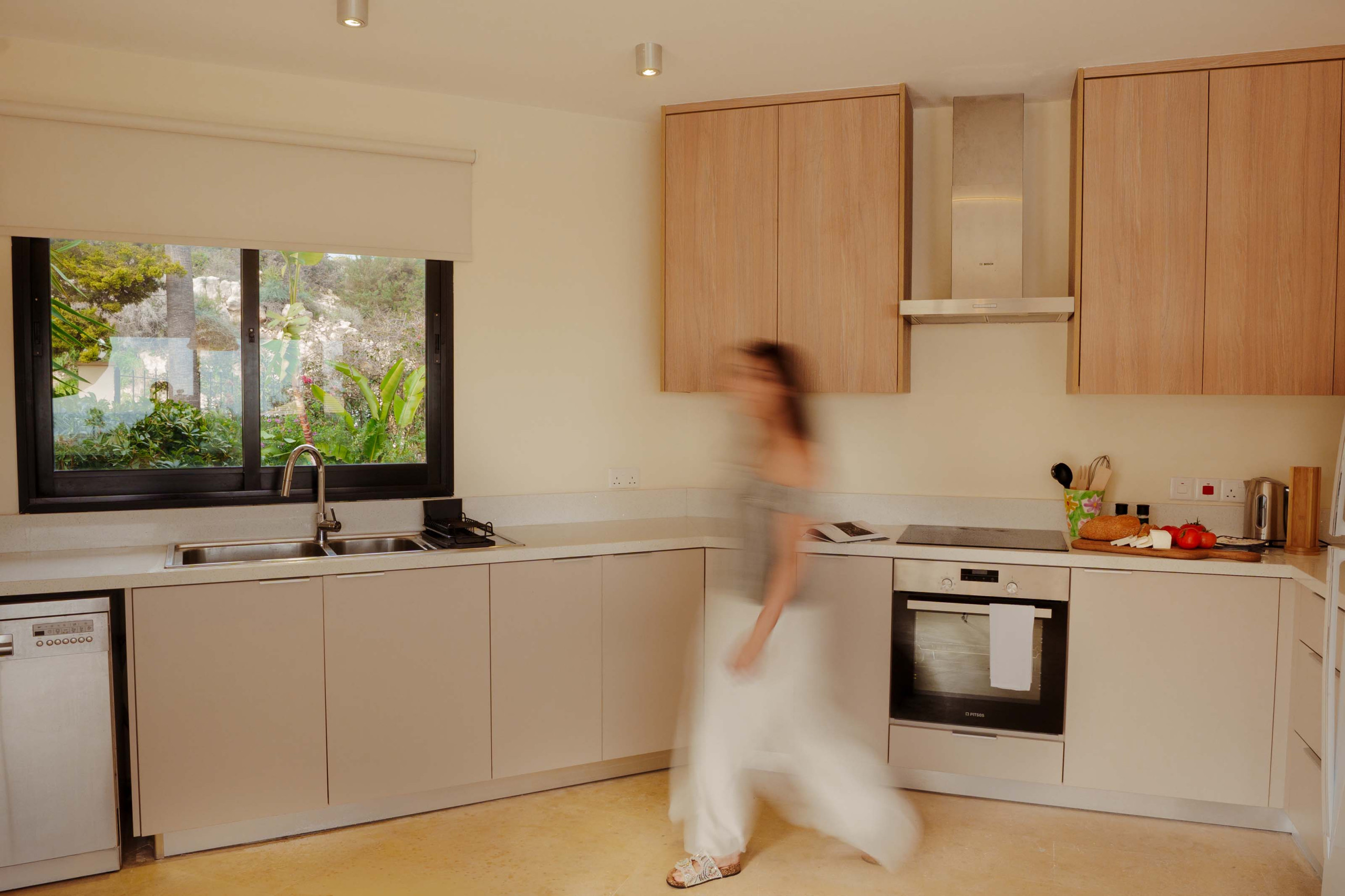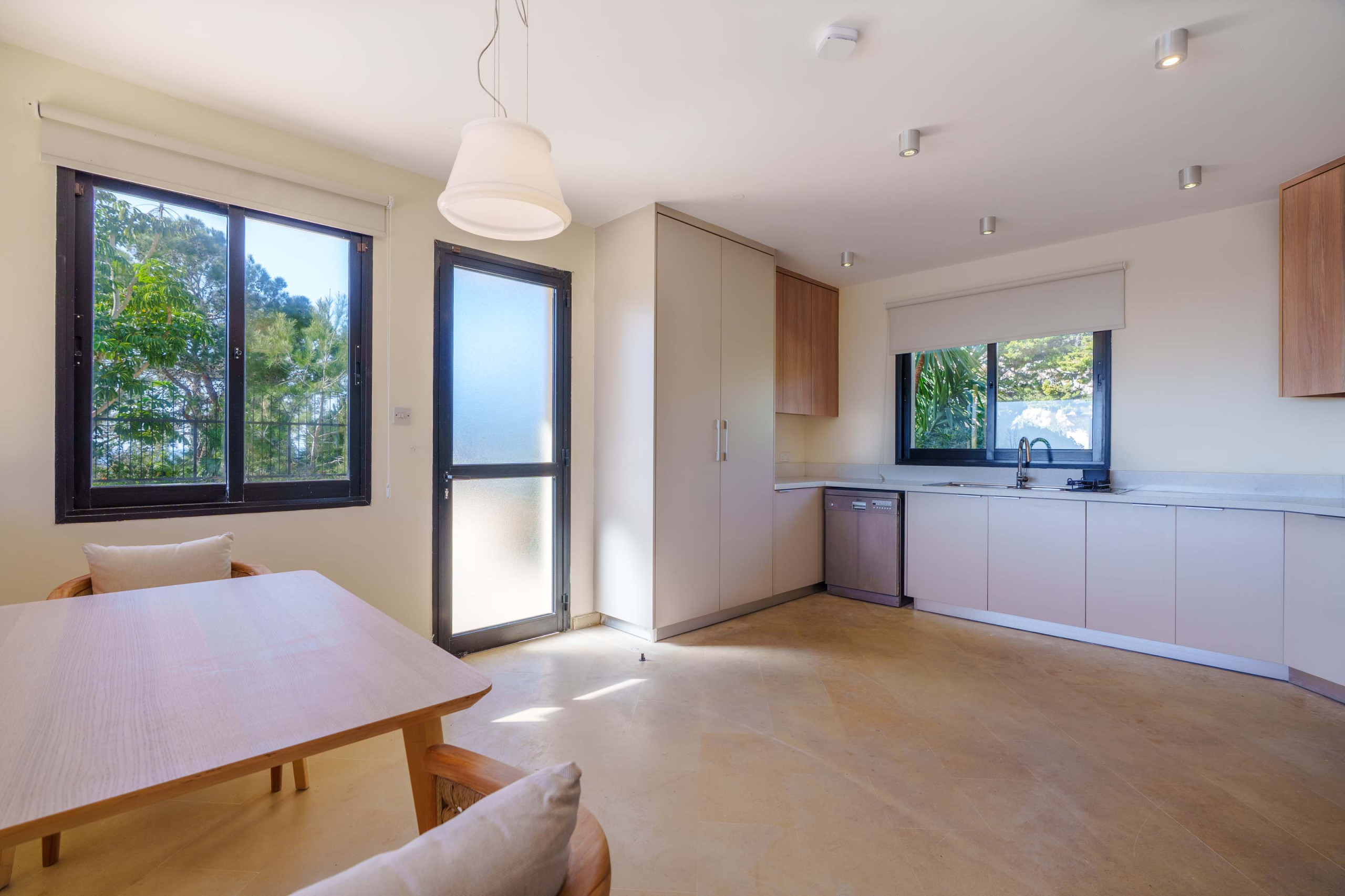 Inside, the atmosphere is calm and inviting, with soft natural tones, open living spaces, and large glass doors that draw the outdoors in. The living and dining area feels bright and airy, offering plenty of room to gather, unwind, and move through the day at your own pace. Whether it is breakfast around the table, a quiet moment with coffee, or a long evening spent sharing food and conversation, the spaces are designed for connection and comfort. The fully equipped kitchen adds to that sense of ease, making everything from simple morning routines to leisurely meals feel beautifully uncomplicated.