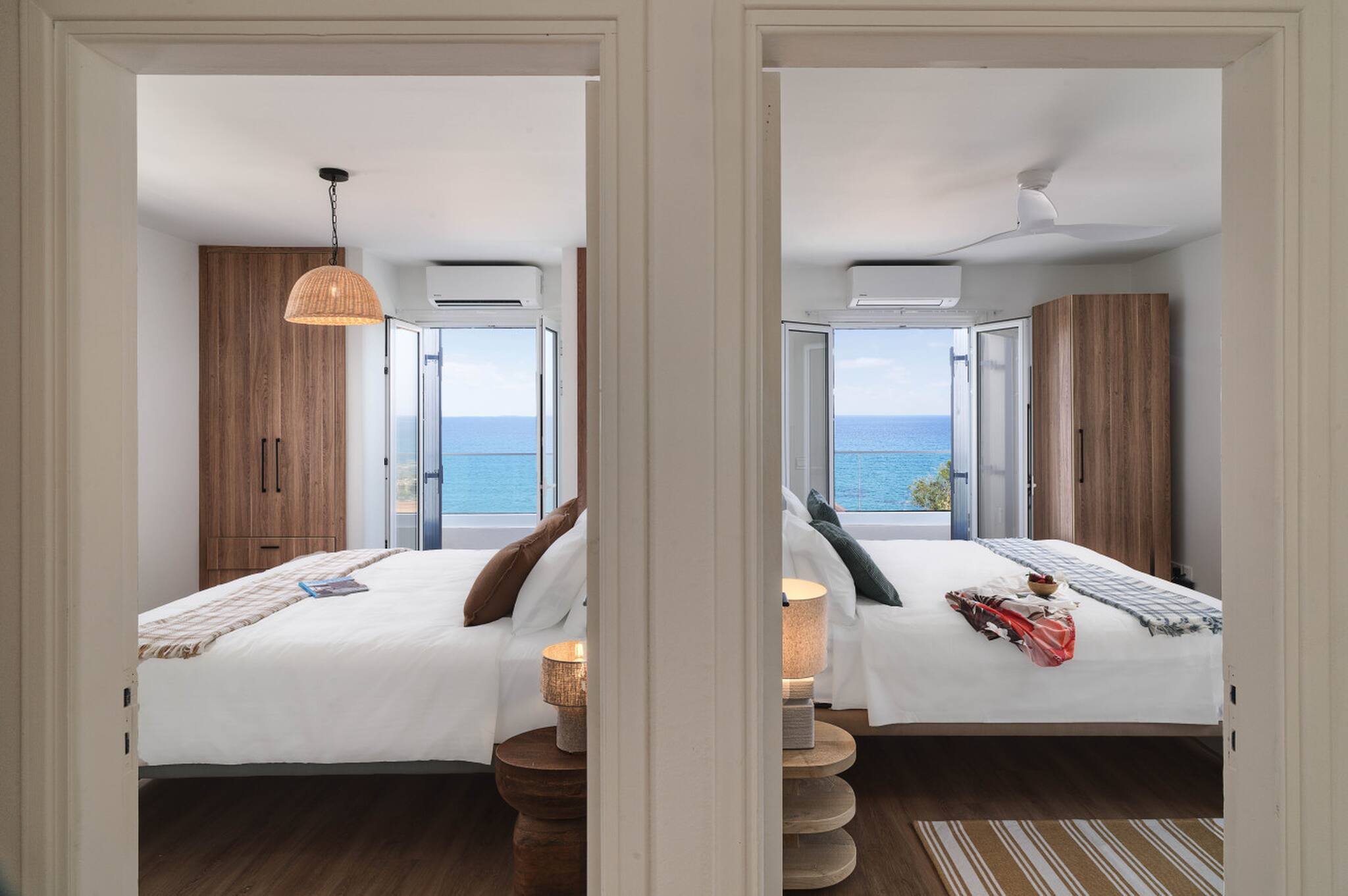 Guests have full access to their private villa, including two bedrooms, a fully equipped kitchen, living and dining areas, a bathroom, guest WC, and a private terrace with sea views. All guests share access to the infinity pool, sun loungers, and direct beachfront entry. For full estate bookings, all five villas and shared spaces are exclusively yours for the duration of your stay.