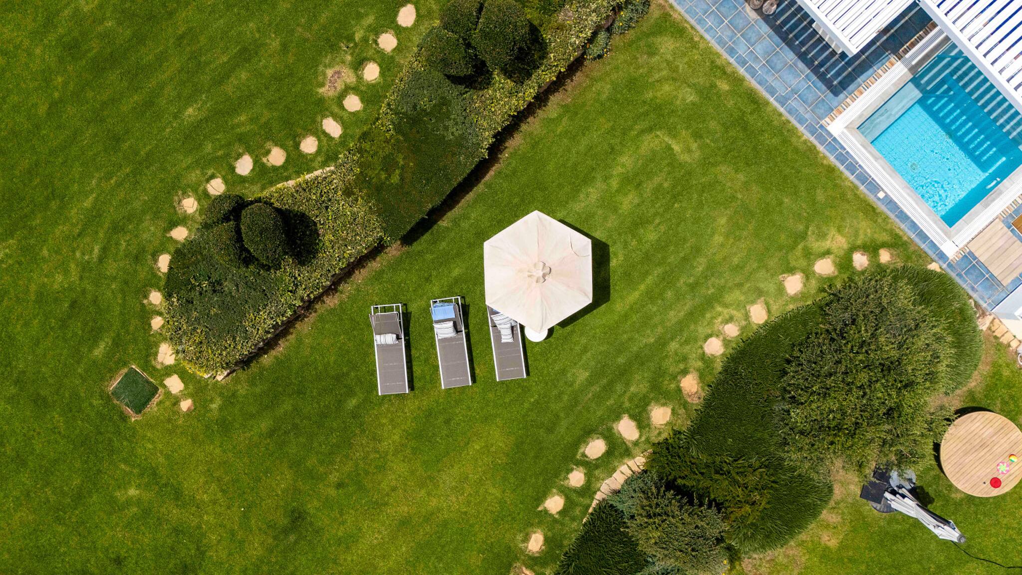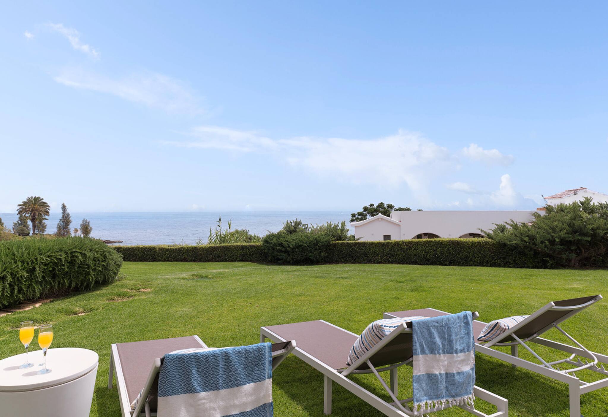 Outside, the private pool is framed by sun loungers, a shaded seating area, and a beautifully maintained sea-facing lawn – perfect for unwinding in the sun, hosting meals al fresco, or simply soaking in the view.