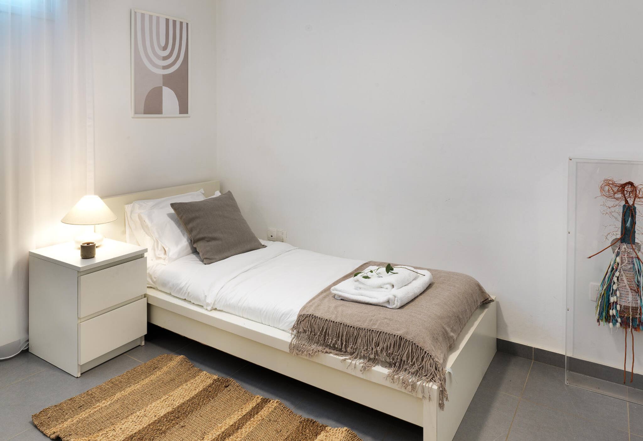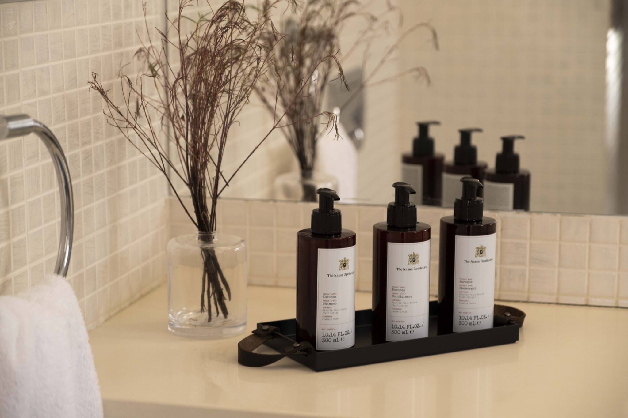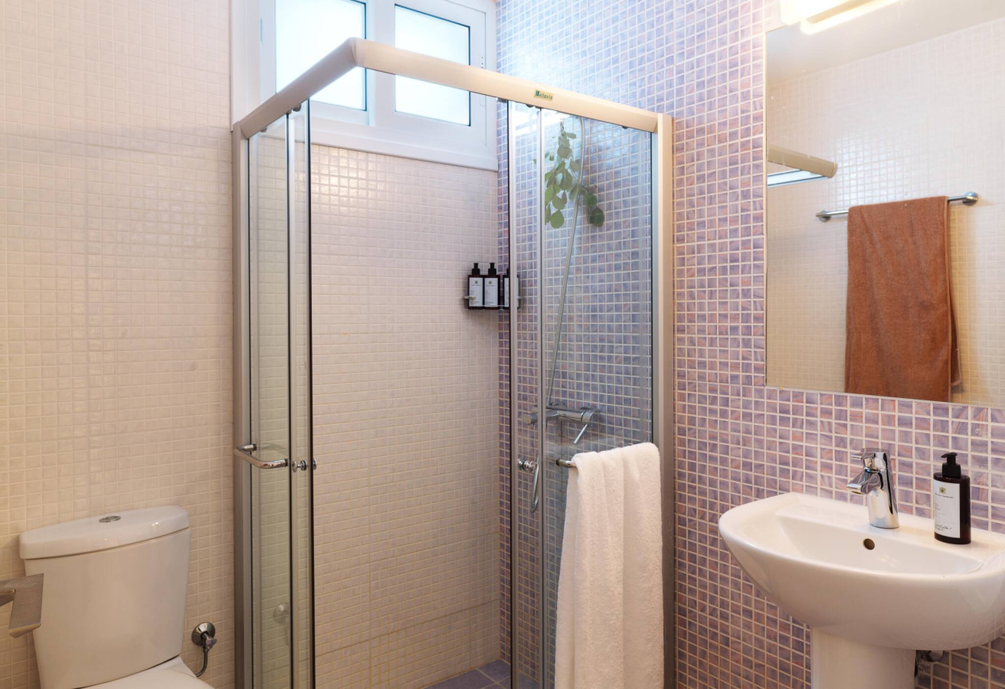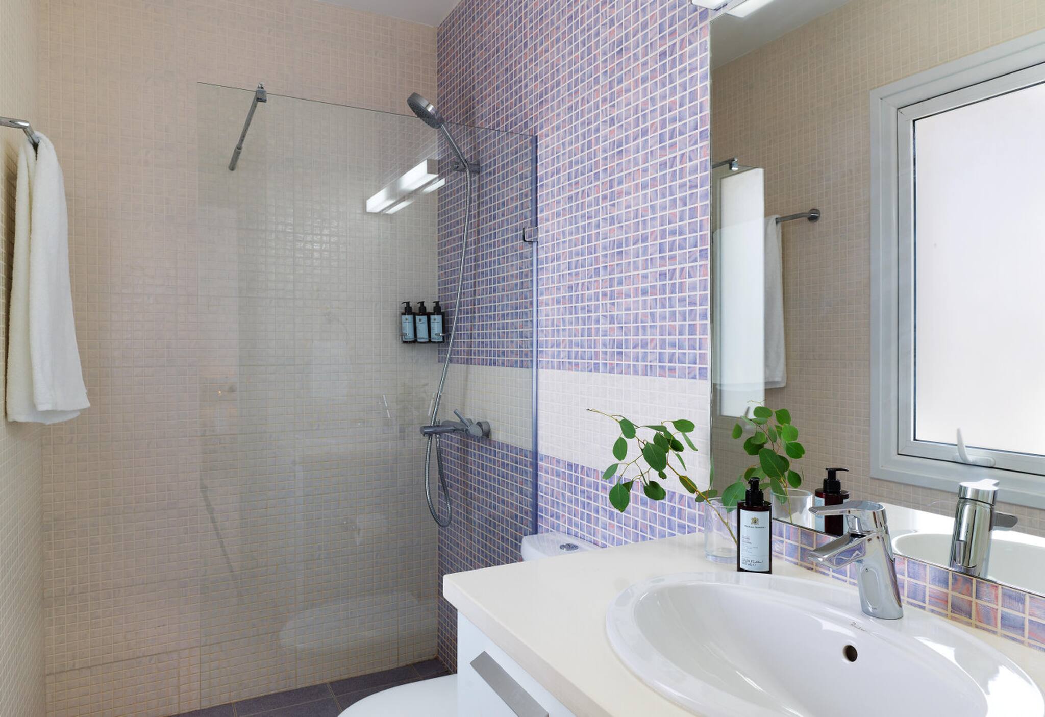 There are five serene bedrooms, designed to accommodate up to 8 guests in comfort. Each room is thoughtfully appointed, with soft linens, clean lines, and peaceful décor that reflects the villa’s Mediterranean setting. Three of the bedrooms feature an ensuite bathroom, while the two single bedrooms are located in the basement of the Villa and share a bathroom. A fifth powder room is located on the ground floor. One of the rooms doubles as a Tv room, perfect for a cozy night in.